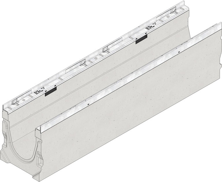 FASERFIX KS 150 Typ 1-9 - Žľab vyrobený z vláknobetónu, trieda zaťaženia A 15 - F 900 podľa EN 1433, značka zhody CE, so spádom dna 0,5 %, s rámami z pozinkovanej ocele a bezskrutkovým rýchlouzáverom SIDE-LOCK, 8-bodové uchytenie a dodatočná aretácia, s perodrážkou s možnosťou ďalšieho vytmelenia, d/š/v 1000x210x220-265 mm, artikel 11001-11009