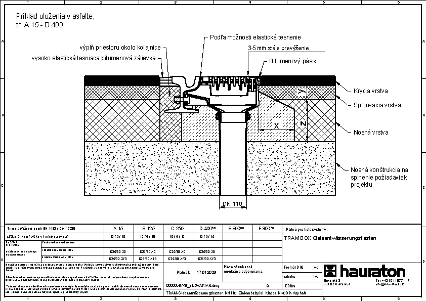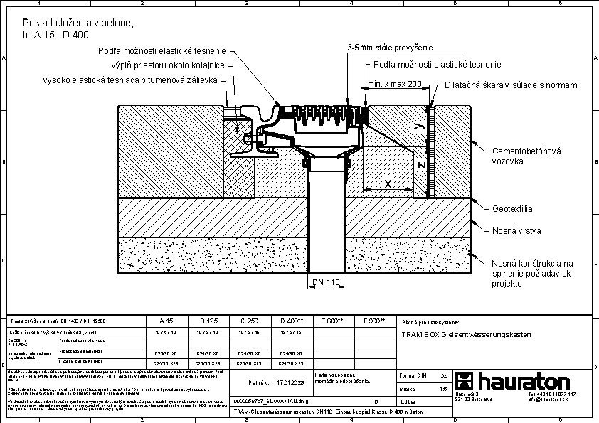 Koľajový drenážny žľab, s GUGI- liatinovým pororoštom oká 15/25 mm, s povrchovou úpravou-KTL, tr. D 400, s vertikálnym vyústením DN/ OD 200, 0,317 m