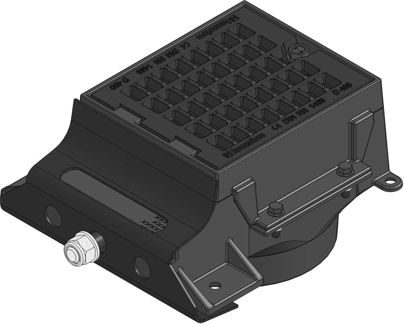TRAM BOX- Koľajový drenážny žľab, s GUGI- pororoštom z tvárnej liatiny oká 15/25 mm, povrchová úprava-KTL, tr. D 400, s vertikálnym vyústením DN/OD 200, 0,317 m, artikel č. 33282